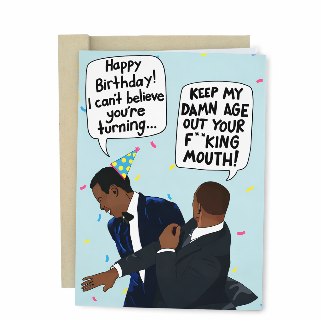 For the friend who loves edgy humor and viral pop culture moments, this birthday card delivers the laughs loud and clear. Featuring a playful, comic-style illustration with party confetti and speech bubbles, the front reads: “Happy Birthday! I can’t believe you’re turning…” followed by the hilarious punchline, “Keep my damn age out your f**king mouth!”