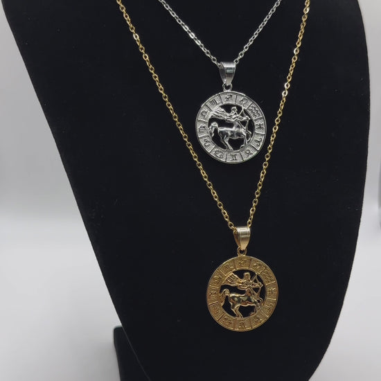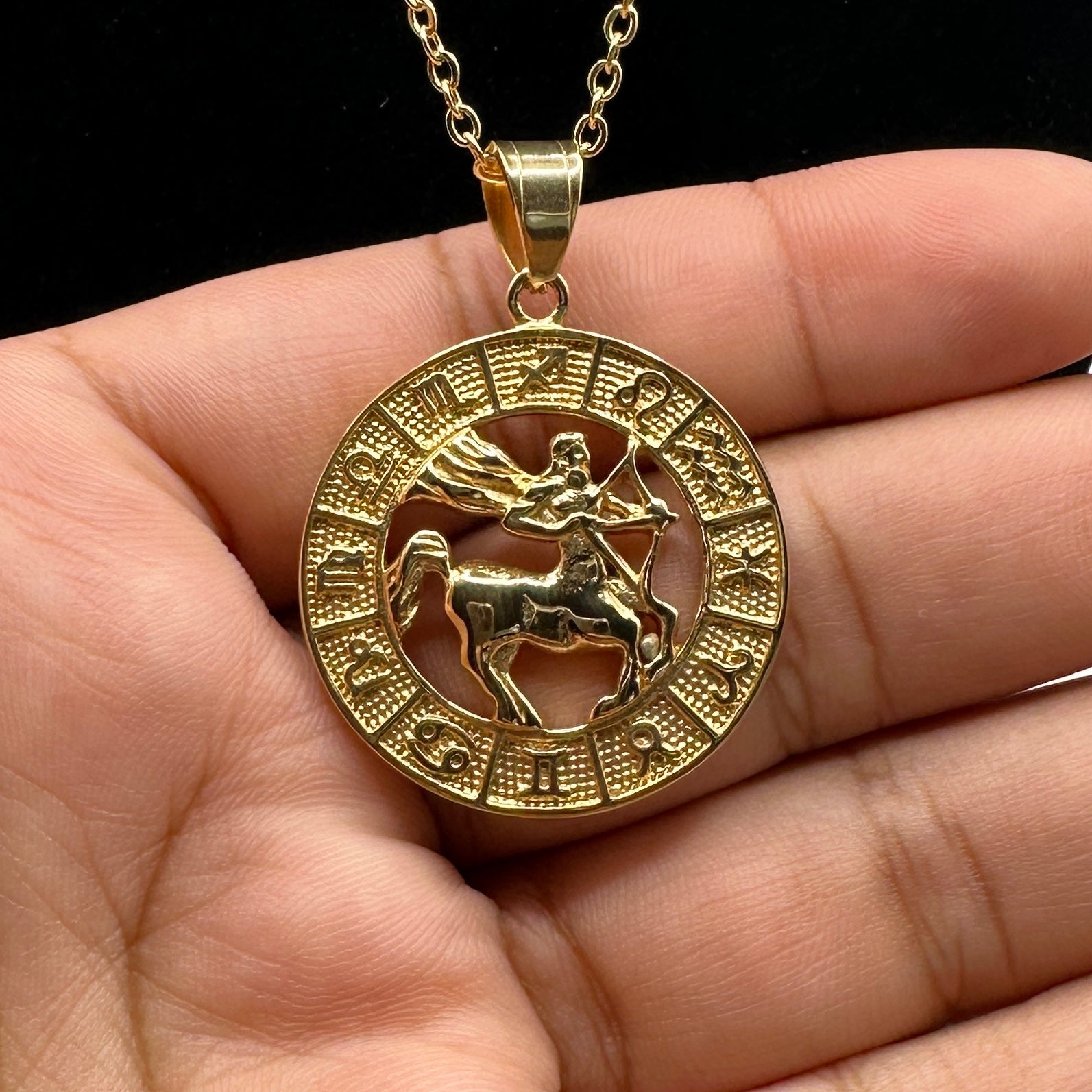 Celebrate your fiery, free-spirited energy with our Sagittarius FIREBOW Necklace. Designed for those born under the sign of the Archer, this statement medallion features an intricate Sagittarius symbol surrounded by bold zodiac detailing. Available in both 18k gold and silver plating finishes, each pendant hangs from a sleek, durable chain perfect for everyday wear or layering.